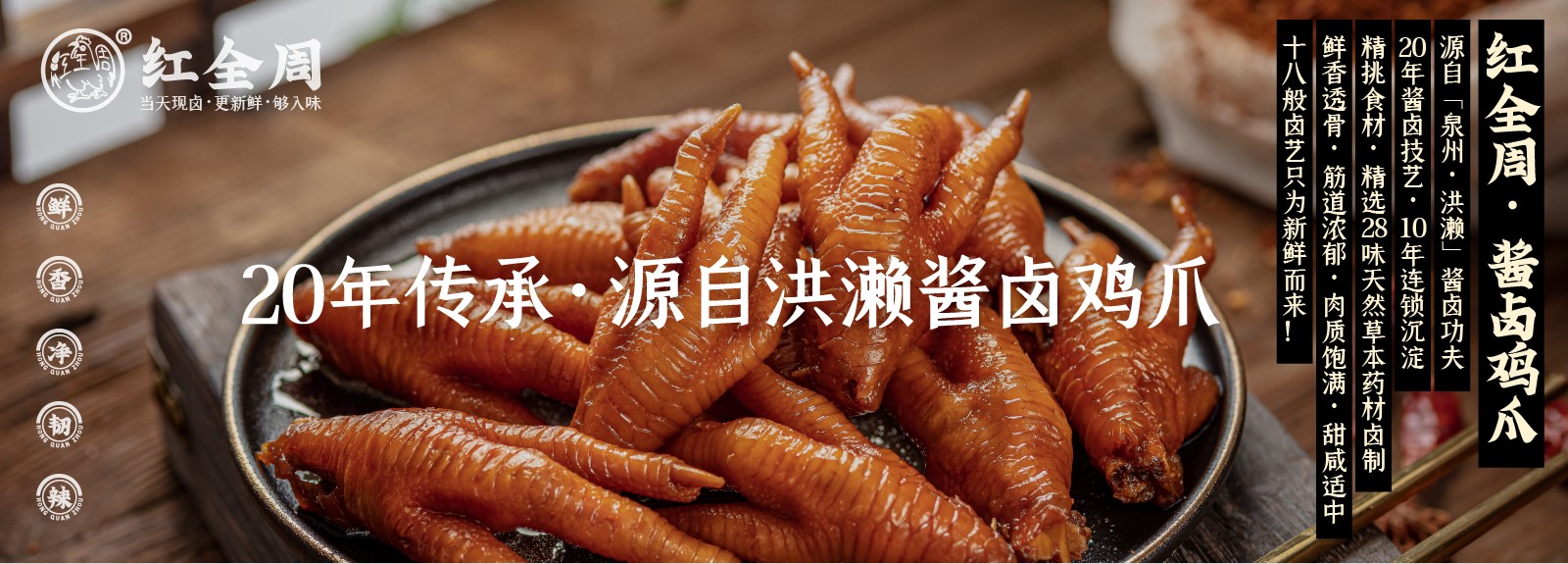 紅全周品牌創立于2012年,其生產總部坐落在以“紅全周雞爪”聞名的福建泉州市南安洪瀨鎮,經張福來師傅多年研制而成的獨家秘方,獨特的鹵制工藝,以“鮮、香、韌、辣”的特點,贏得廣大食客的交口稱贊。紅全周繼承中華美食傳統,堅持以“細微處見風范,毫厘間定乾坤”的服務準則,遵循現代健康飲食理念,精選上等食材,致力為消費者提供安全、健康的美食新體驗。